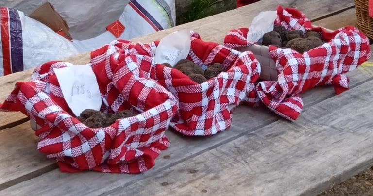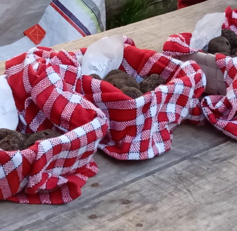 So what is all the fuss about? Black diamonds they are called and can cost hundreds of euros a kilo. The Black Quercy Truffle is the star of the truffle world; rich in complex aromas of the undergrowth, peppery and pungent. It grows beneath oak trees, and sometimes hazel, lime and pine, and it likes chalky, limestone soil. This is the edge of the Quercy Blanc region; Quercy from quercus the Latin name for the oak tree - the region named by the Romans, and Blanc for the limestone that emerges through stark white stones in the fields and raw bleached cliffs where the earth has moved. So it’s a food source and therefore of infinite interest and value to the residents of France. It is added to all nature of dishes as well as to preserves and oils, game pâté, foie gras and even scrambled eggs.