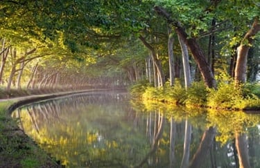 The Canal du Midi from Toulouse to Adge. The two navigable canals join together linking the Atlantic and the Mediterranean Sea.