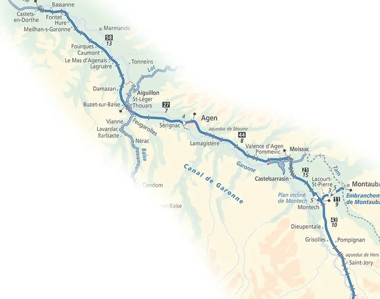 The Canal de Garonne (Deux Mers Canal) joins the river Garonne at Castets en Dorthe then continues South until it becomes the Canal du Midi at Toulouse.