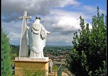 The statue of the Virgin Mary stands on top of the hill called Calvary and overlooks the town of Moissac.